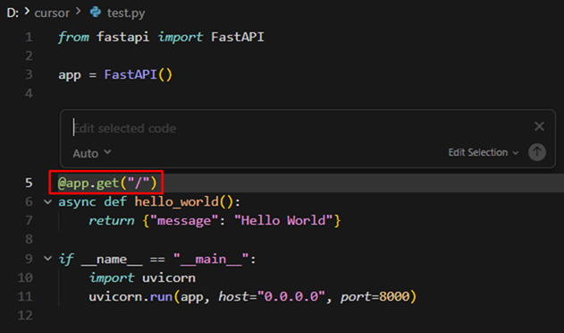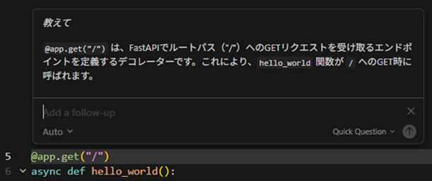 1.5行目の@app.get("/")についてCursorに説明してもらいます。