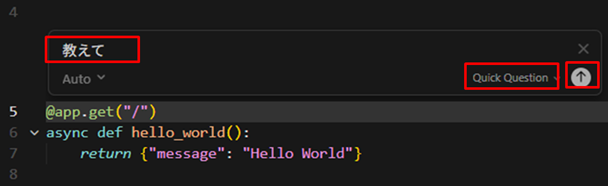 2.入力欄に「教えて」と入力し、右下で「Quick Question」を選択し、上矢印のアイコンをクリックします。