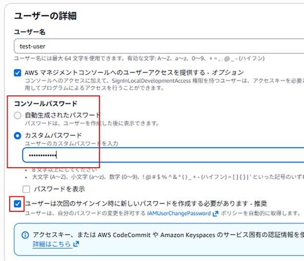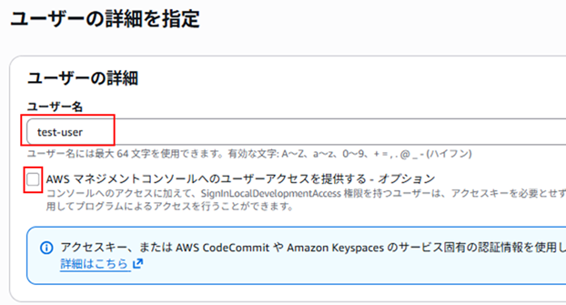 「AWSマネジメントコンソールへのユーザアクセス」にチェックを入れると、ログイン画面からログインできるようになります。チェックを入れます。