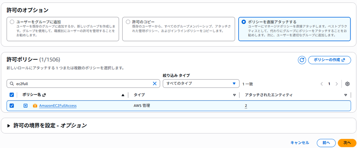 「ポリシーを直接アタッチ」を選択し、「ポリシーのフィルタ」にec2fullと入力し、「AmazonEC2FullAccess」にチェックを入れます。「次へ」をクリックします。