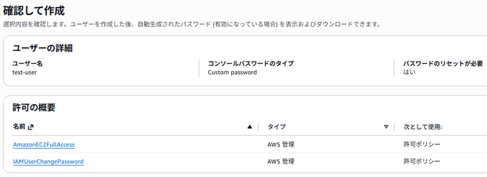 「ユーザーの作成」をクリックでユーザが作成されます。