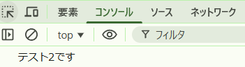 3.consoleタブをクリックすると上記コードにある文言「テスト2です」が表示されます。