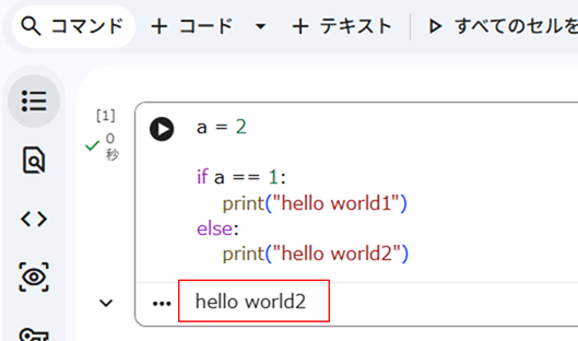 5.実行結果のhello world2が、コードの下に表示されます。